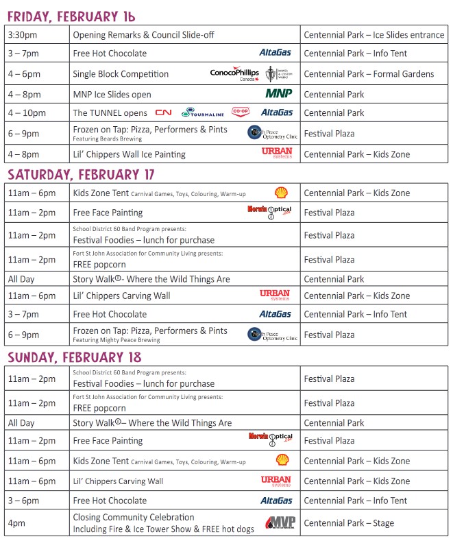 Every winter for the last 19 years, the City of Fort St. John with help of generous community sponsors has put on this fun celebration of winter in Centennial Park. With a bonfire and hot chocolate to keep visitors warm inside and out, the Park is filled with professional snow and ice carvings, ice slides and opportunities for everyone to learn the art of carving.