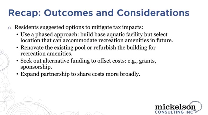 Throughout the public engagement, Mickelson said that the cost tolerance among residents was not very high. “We consistently heard a concern about what this cost means to them, and the tax impact. What came through was, yes, we want this, but it’s more than a lot of us can afford.”