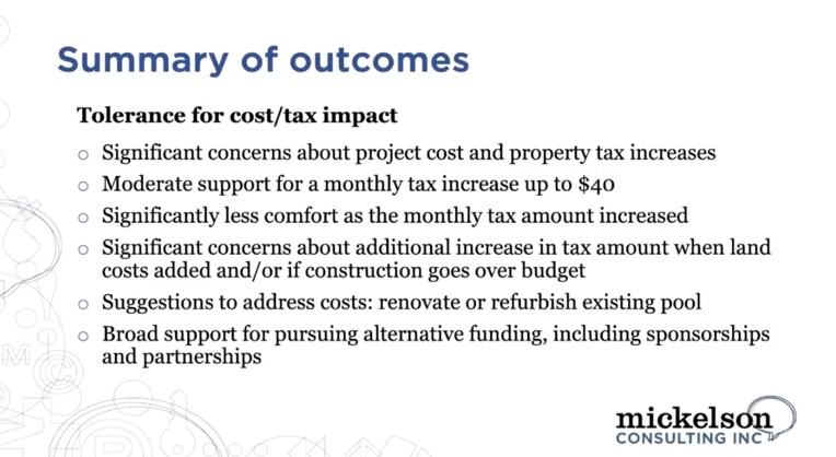 Therese Mickelson, of Mickelson Consulting which conducted the public engagement said that residents have significant concerns about the cost, although they do recognize the need for a new facility.