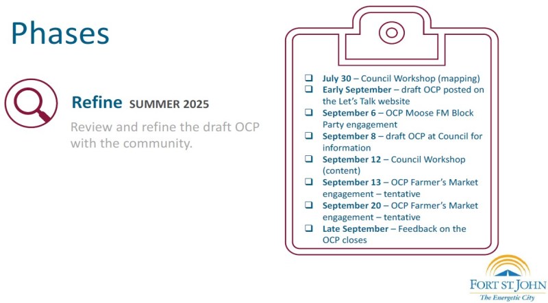 The draft OCP will be posted on the city’s Let’s Talk Fort St. John website in early September, and staff will present it to Council on September 8. Opportunities for public feedback will continue at the Farmers’ Market until the end of September.