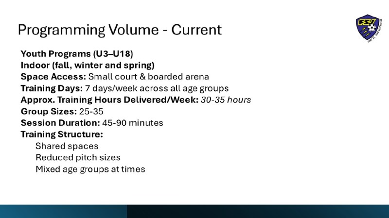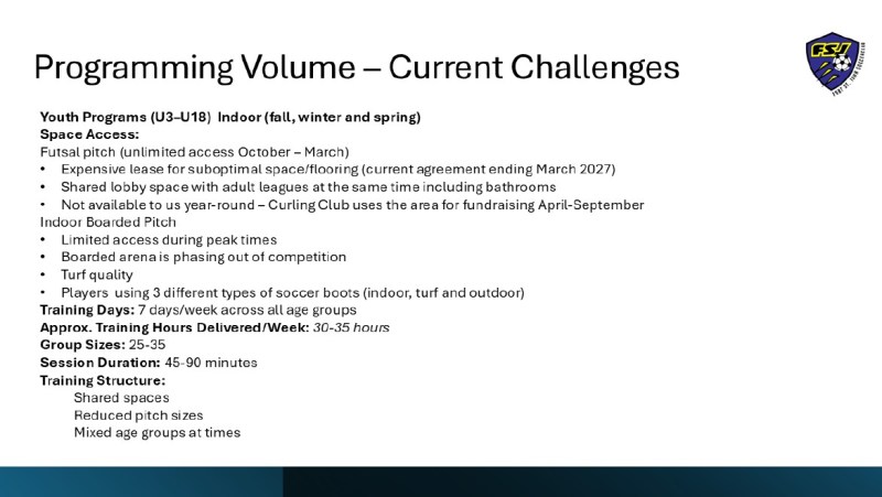 The Fort St. John Soccer Club, which is using the Kids Arena Field House, as well as four of the FSJ Curling Club’s sheets of ice for Futsal, says the suboptimal spaces they’re currently using doesn’t encourage the development of players. The space in the Kids Arena doesn’t match Canadian Soccer standards, which creates challenges for players when they go away to tournaments because of the size differences. It also makes it difficult to host tournaments in Fort St. John.
