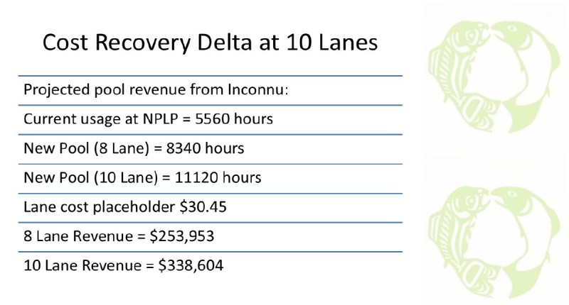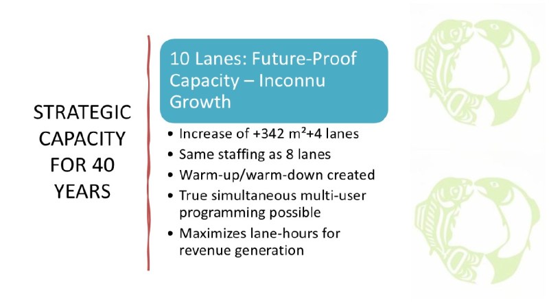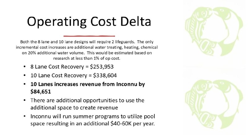 Having more and wider lanes would allow Inconnu to host more programs, which would provide additional revenue to the pool, aiding in the city’s cost-recovery goals. The additional revenue from Inconnu in a 10-lane pool over an 8-lane pool is projected to be $84,651, according to McKinnon.