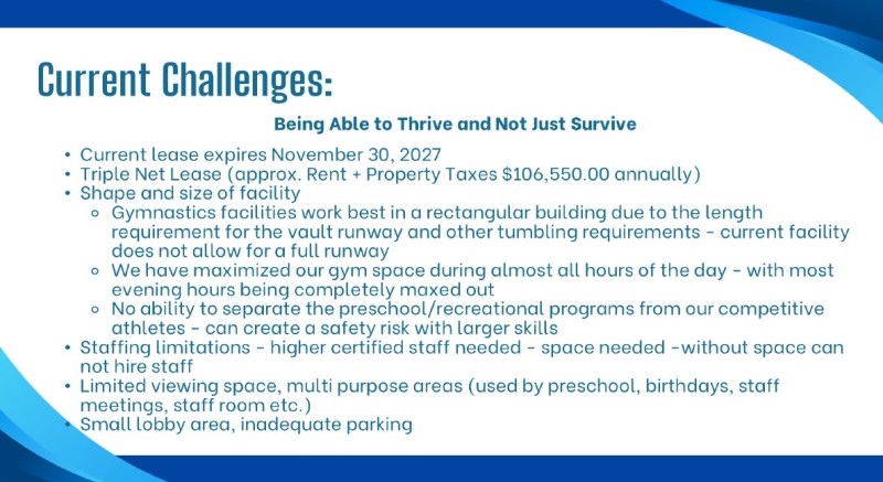 They’re looking for enough space to continue to grow, with a space large enough to host competitions, and somewhere to store large equipment, as well as a viewing area for families at all times.
