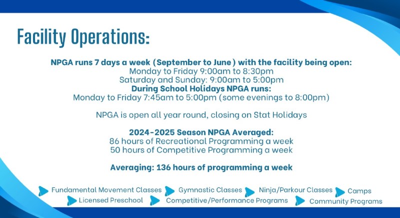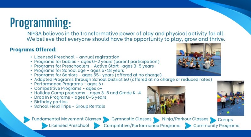 Like the other groups, NPGA is bursting at the seams in their current facility, and they too need room to grow. During Covid, NPGA’s numbers dropped to 633 members, but since then have risen to the current 836 full/annual members. This doesn’t include drop-in users, school field trips, birthday parties and rentals or one-time events.
