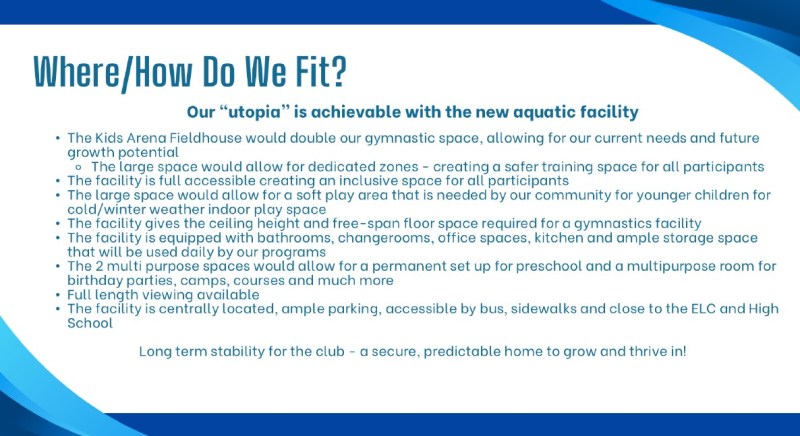 Having a space for the soccer club in the new facility, would not only free up the ice sheets in the Curling Club so that they could have more players, but it would also enable the North Peace Gymnastics Association to find a new, permanent home that fits their needs, by moving into the Kids Arena Fieldhouse, NPGA executive director Chantelle Yates told Council.