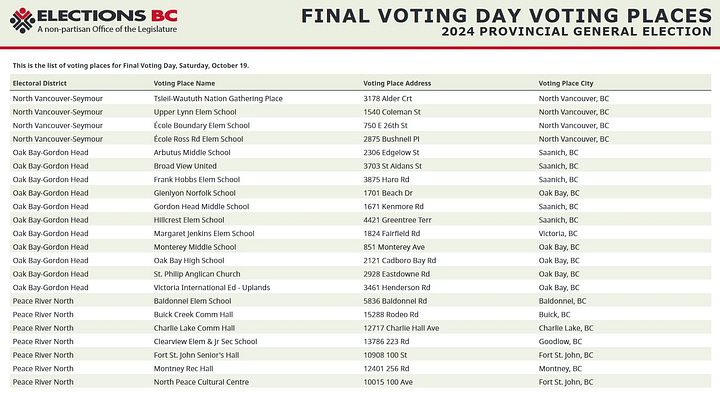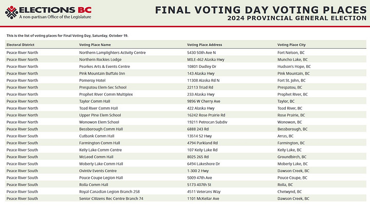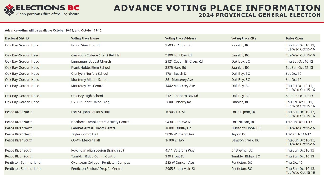 Final Voting Day is Saturday, October 19. Voting places will be open from 8 a.m., to 8 p.m. Pacific Time. See the charts below for the Voting Places in Peace River North.