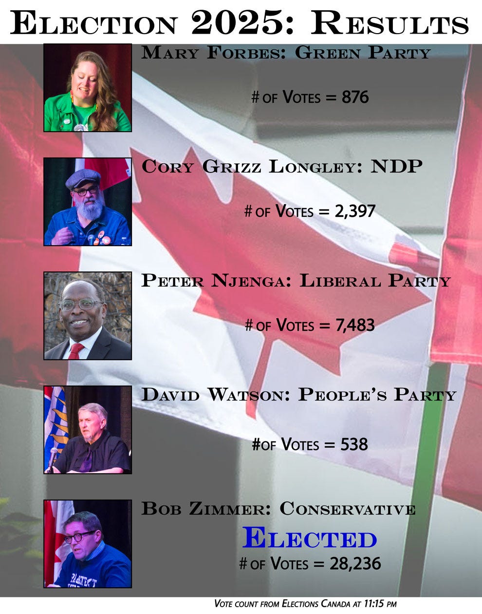 Incumbent Conservative Party of Canada candidate Bob Zimmer was re-elected on April 28 as the MP for Prince George-Peace River-Northern Rockies, after receiving 71 percent of the votes. The Liberal Party of Canada candidate, Peter Njenga, took second place with just 18.8 percent of the votes, while the NDP’s Cory Grizz Longley rounded out the top three with six percent of the votes.