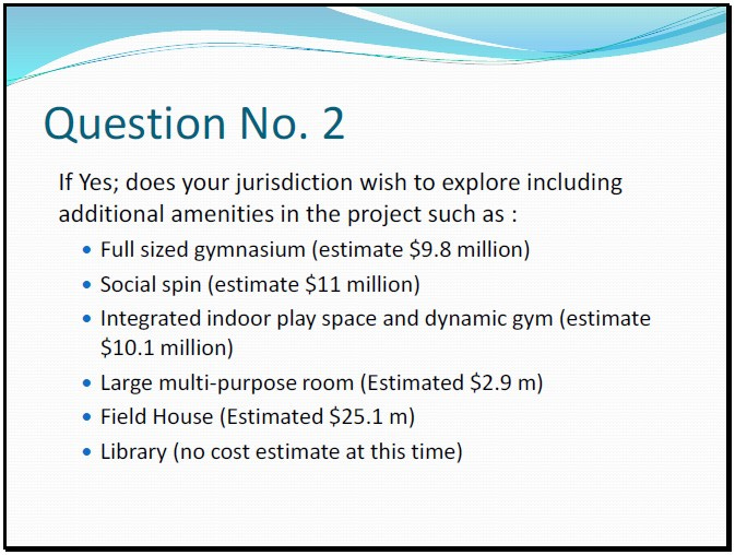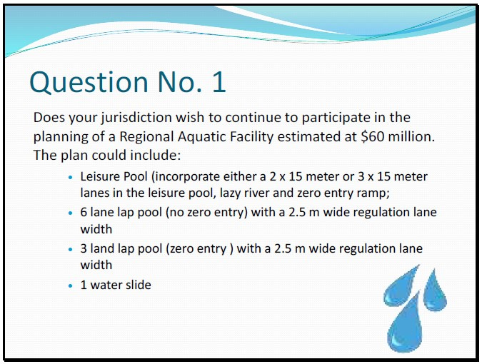 In order to hold a referendum about the proposed facility before the end of the year, at the July 9 meeting, the committee should have selected the facility and amenity scope – that is, which pool size and number of amenities the communities wish to proceed with – and established the facility cost, loan authorization amount and the taxation model to pay for it.