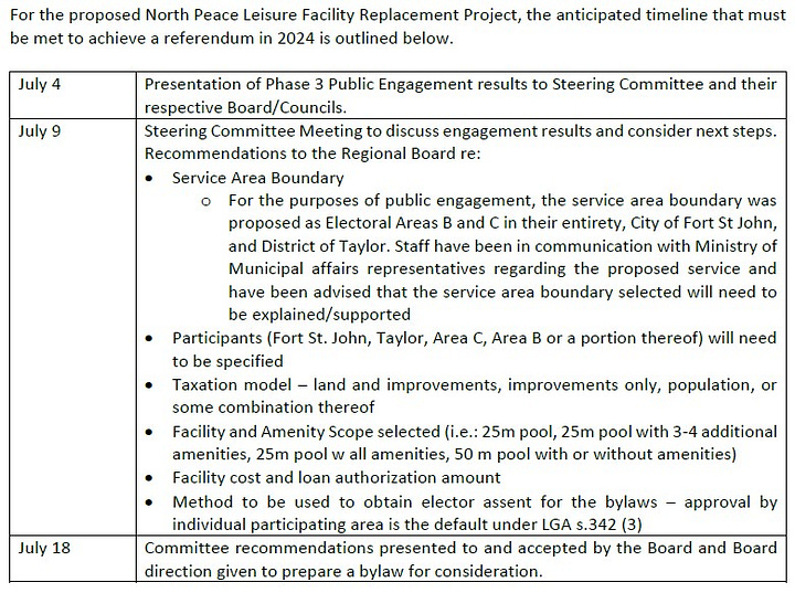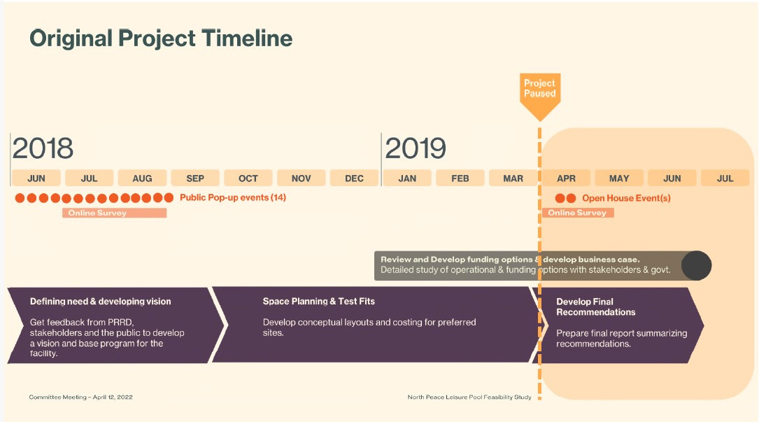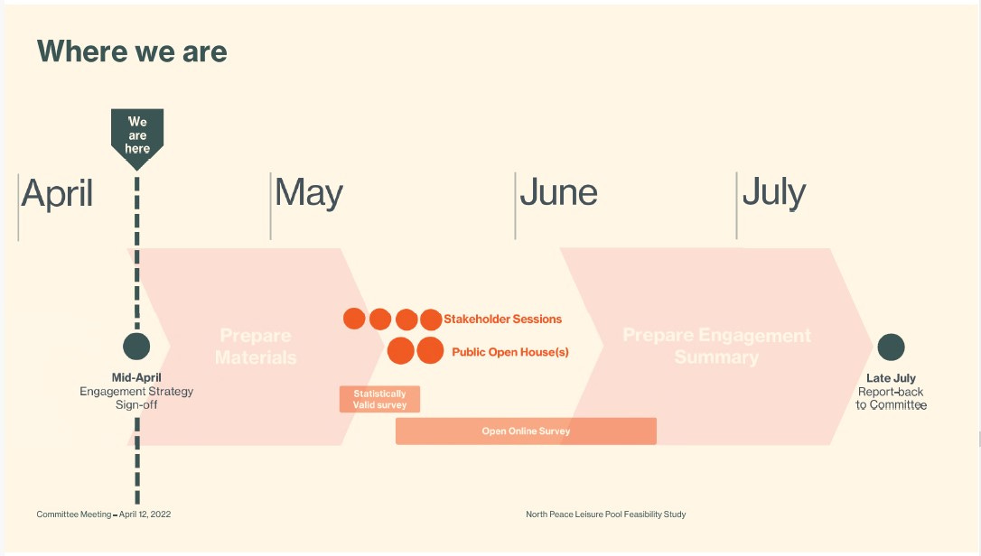 It was not until June 2020 that the regional district board decided to create a pool replacement committee, and it was another 18 months – December 2021 – before the Terms of Reference for the North Peace Leisure Facility Replacement Steering Committee was developed. The first meeting of the Steering Committee took place in March 2022.