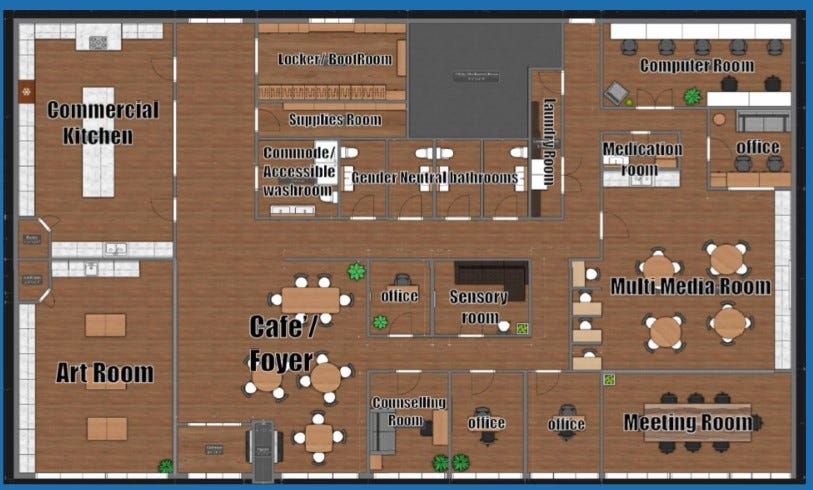 The first step was moving the offices out of the building on 100 Avenue to a new location at the corner of 100 Street and 104 Avenue – the main entrance is on 104 Ave., across from Save-on Foods. By removing the offices from the main location, FSJACL now has 6,000 square feet of space to transform into an accessible community space with a commercial kitchen, sensory room, music and art spaces, computer and meeting rooms as well as a community lounge.