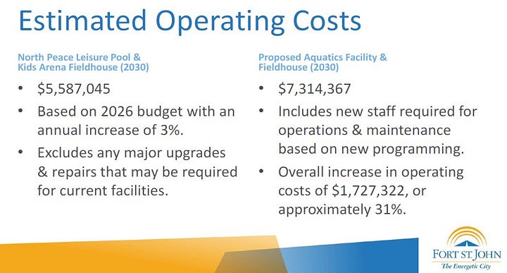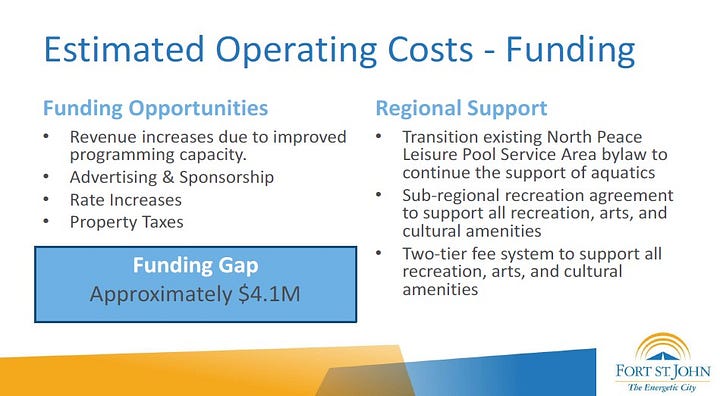 Panoulis took Council through the financial proposals for the project, and the potential options to address the operational shortfall, including “transitioning” the 1995 North Peace Leisure Pool Local Service Area Bylaw to support operations of the new facility.