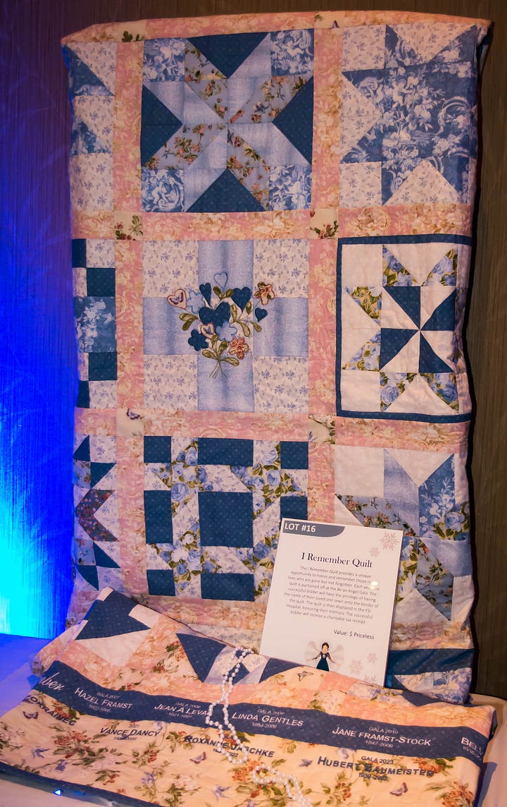 The I Remember Quilt is auctioned off each year at the Gala, and the successful bidder has the privilege of having the name of a loved one sewn into the border of the quilt. The quilt is then displayed in the Fort St. John Hospital, honouring their memory.
