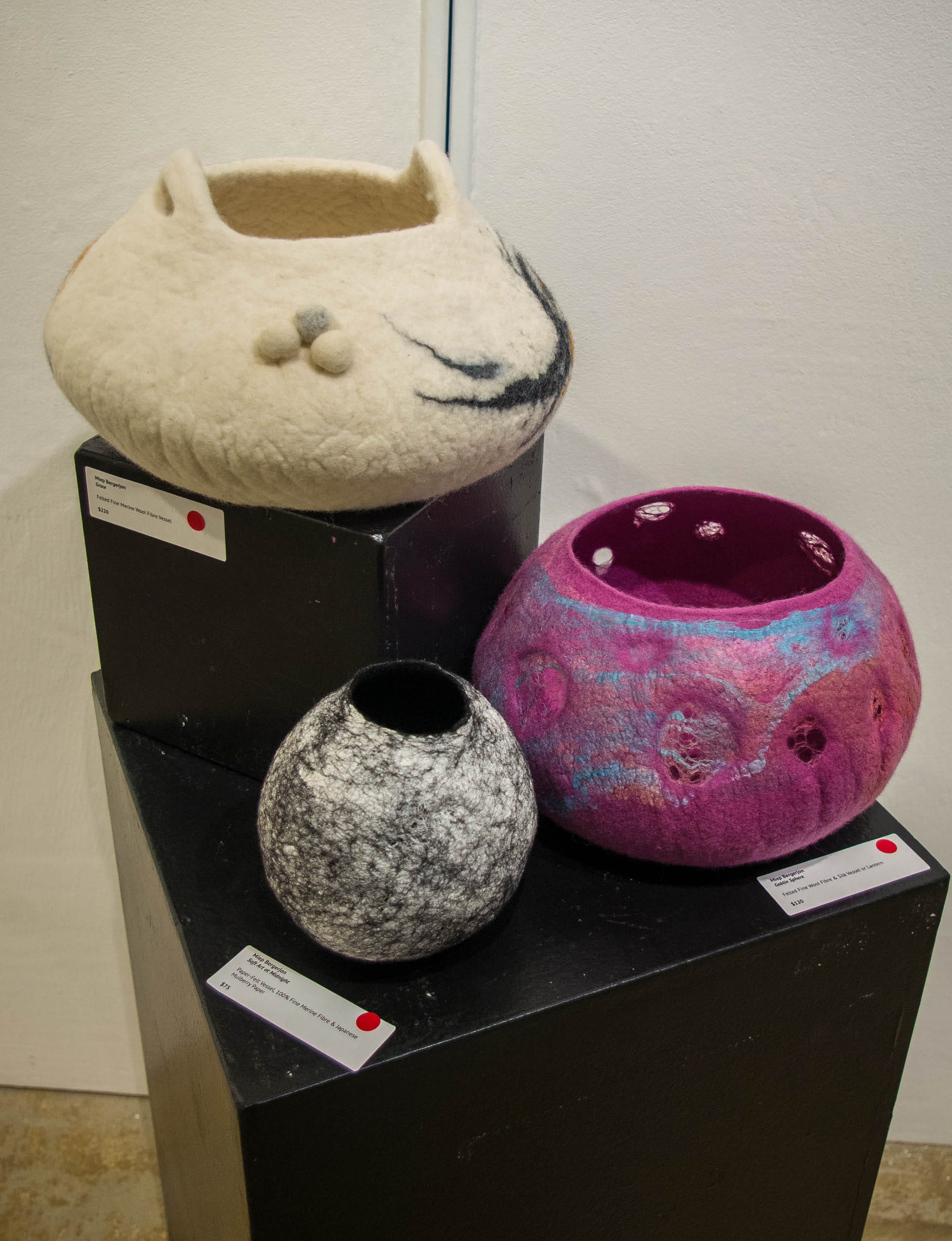 In addition to the many rug hooking pieces in the exhibit, Miep has created several pots using felted wool, which look like pottery.