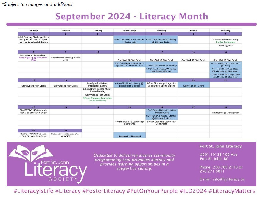 Over 700,000 people in British Columbia struggle with literacy, to assist with overcoming these challenges, the provincial literacy organization, Decoding Literacy Solutions, along with the Fort St. John Literacy Society are encouraging everyone to support literacy programs in BC through the #PutOnYourPurple and #LiteracyRippleEffect campaigns this month.