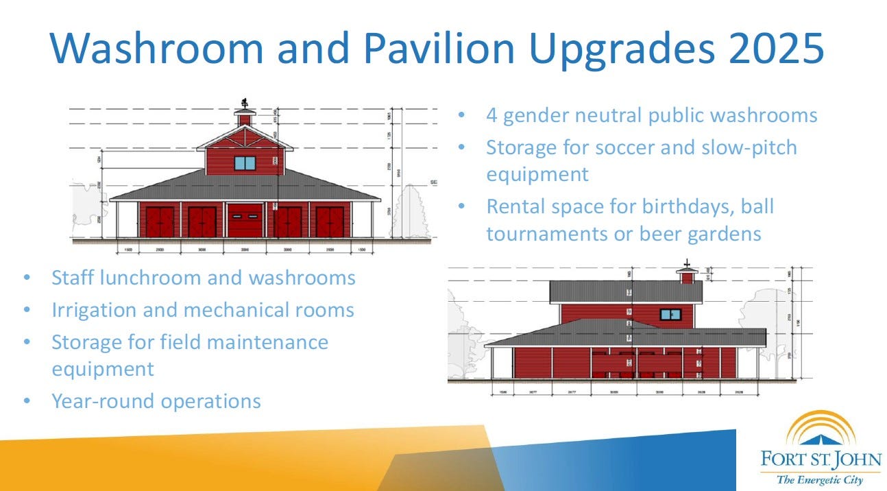 Upgrades to the washroom and pavilion include adding storage for soccer and slow-pitch equipment, rental space for birthday parties, ball tournaments and beer gardens, irrigation and mechanical rooms, storage for field maintenance equipment and staff lunchroom and washrooms to support year-round operations.