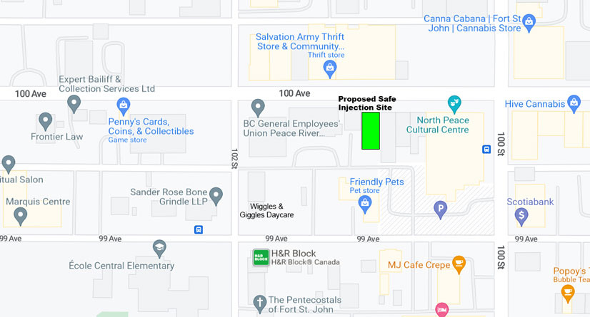 At the regular meeting of the Board of School Trustees on March 13, 2023, Trustee Tom Whitton brought forth his concern that the proposed safe injection site is too close to Ecole Central Elementary School, and other locations where young children gather, on a daily basis. The proposed site is on 100th Avenue, in the old H&R Block building. The building, which is currently being used as a warming centre, is within a block of the North Peace Cultural Centre (home to the Public Library), a daycare and Ecole Central Elementary School. Whitton was especially concerned that there was no communication from Northern Health when they selected the proposed site.