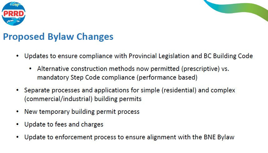 The PRRD is updating its Building Bylaw to bring it into alignment with changes made at the provincial level and to the BC Building Code, as well as to allow for alternative construction methods designed to meet net-zero construction requirements.