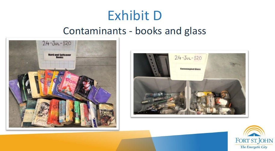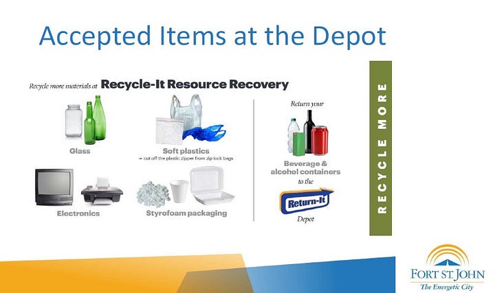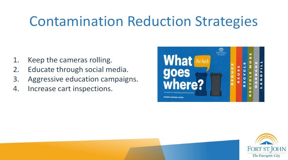 If the recycling contamination is not reduced immediately and dramatically, Recycle BC may refuse to accept any more product from Fort St. John. This would force the city to pay to have the product disposed of at the landfill, incurring an estimated $60,000 in additional disposal fees and forfeiting $250,000 in annual revenue.