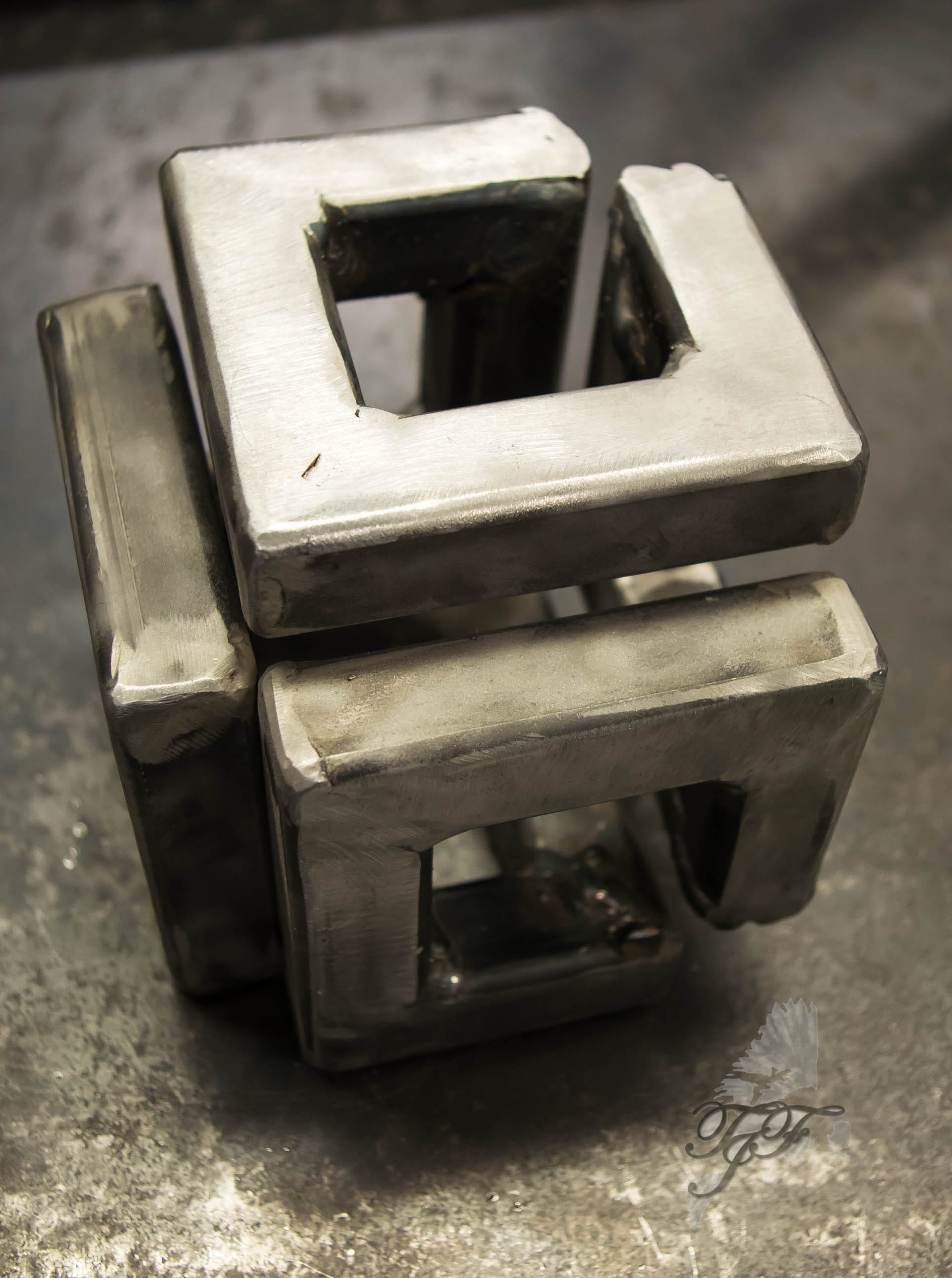 So, McColm started the students off learning to accurately measure, cut and weld by building infinity cubes, working in teams from a visual set of plans, correctly identify all the angles, learn how to use the tools to assemble them properly, and then they weld the cube in three sections before welding the whole thing together.