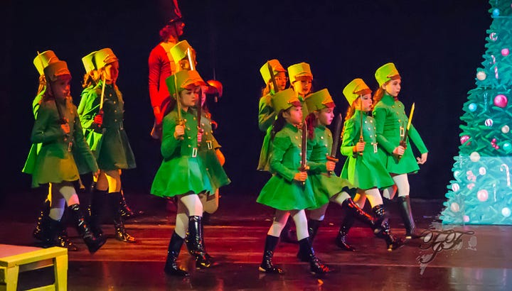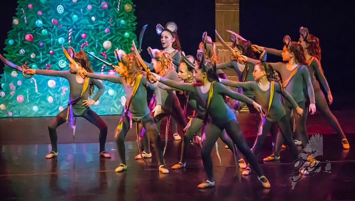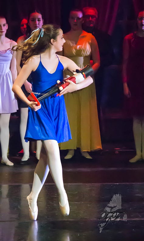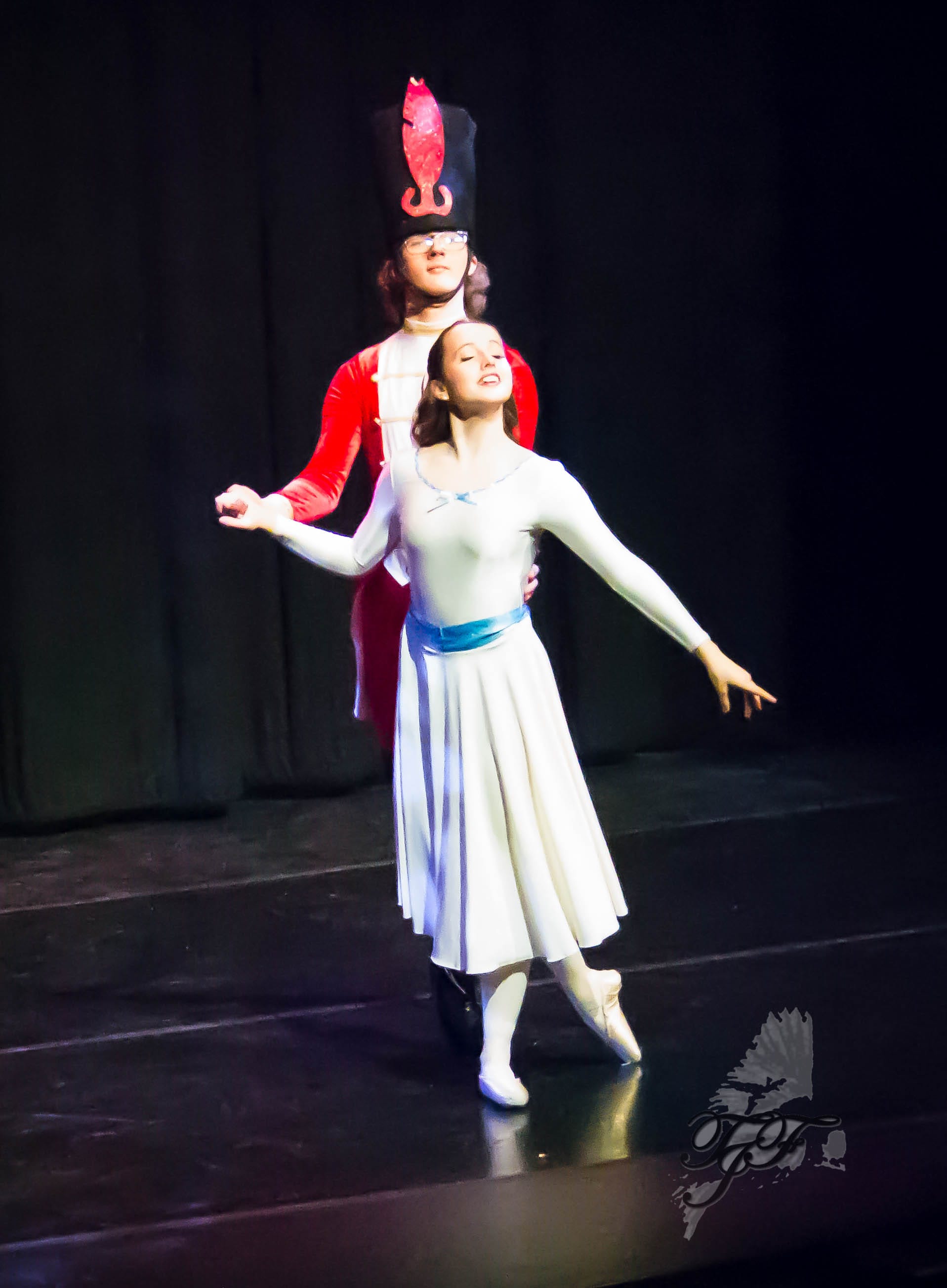 Kenlee who plays Sugar Plum Fairy started out as a Mouse and a Clown, Emily who also plays Sugar Plum Fairy started as an Angel and a Snow; Temperance and Macey who play Clara, were also once two of the Mouse King’s mice, while Macey was a Clown as well. Sebastian, who has played the Nutcracker the last two times Nutcracker has been performed began as one of the horses pulling the sleigh.