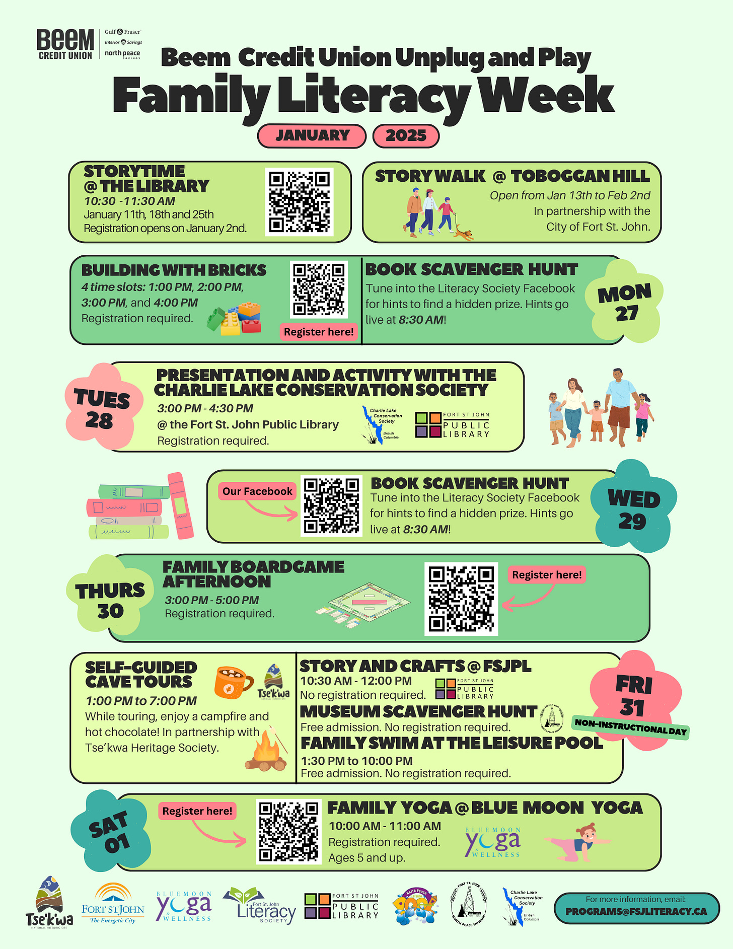 There are variety of fun literacy-related family events leading up to and during Family Literacy Week, including Family Board Games at the North Peace Cultural Centre, the Great Big Buddy Read in partnership with SD60, Story and Craft Time at the FSJ Public Library, and a special event, self-guided cave tours, on the January 31 Non-Instructional Day at the Tse’Kwa Heritage Society (Charlie Lake Caves) site.