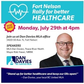 The rallies were to take place today at 4 p.m. in Fort Nelson and Fort St. John, but are now rescheduled to Monday, July 29 at 4 p.m. at Davies’ office in Fort Nelson; and Tuesday, July 30 at 4 p.m. at the green space at 100 Street and 100 Avenue in Fort St. John.