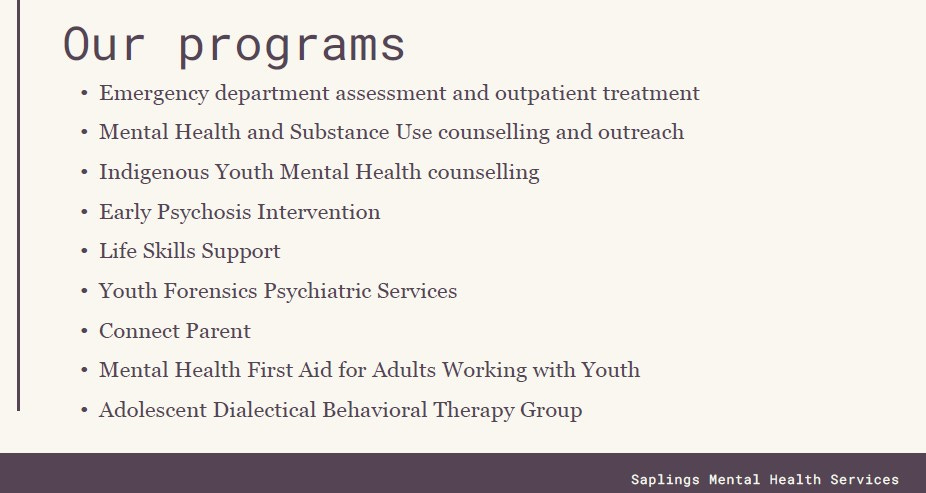 Check out the website or Facebook page for more information about Saplings Mental Health Services, and the programs they offer.